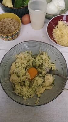 Dans un grand saladier, mélanger les pommes de terre, les courgettes, la chapelure, le fromage râpé, l’oeuf, le lait. Poivrer et ajouter de l’aneth (ou autre herbe fraîche). Couper la mozzarella en petits cubes.