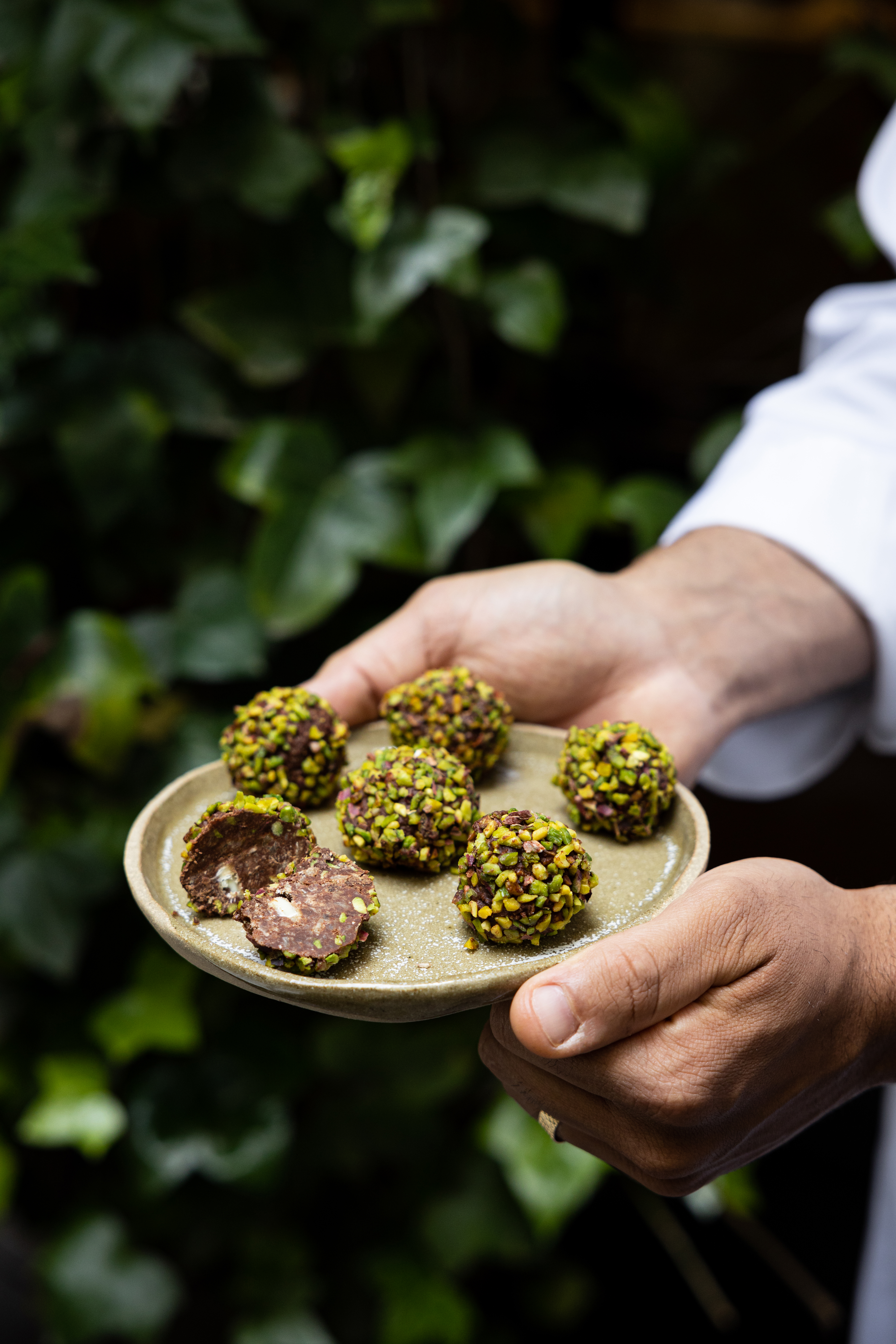 Modelez des petites boules et roulez-les dans les pistaches concassées avant de déguster.