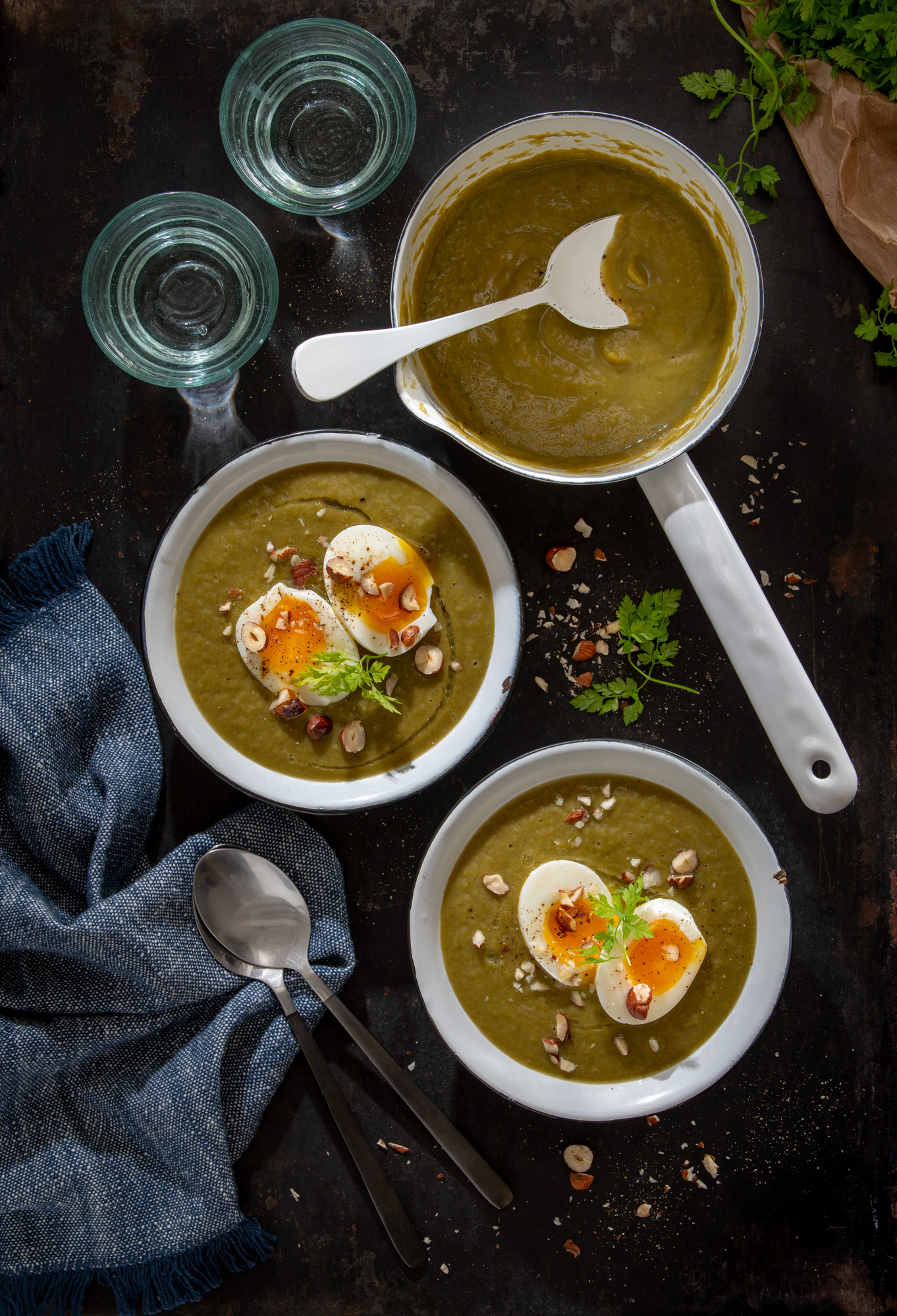 Rincez les légumes, épluchez les navets, les pommes de terre et les oignons, et découpez-les ainsi que les poireaux en morceaux. Placez-les dans une grande casserole avec le beurre et faites revenir le tout pendant 5 minutes. Versez ensuite le bouillon de légumes, portez à ébullition et faire cuire le tout pendant 40 minutes. Pendant ce temps, portez de l’eau à ébullition dans une petite casserole et faites cuire les œufs pendant 6 minutes. Placez-les directement dans un bol d’eau froide puis écalez-les. Concassez les noisettes. Une fois les légumes cuits, mixez le tout à l’aide d’un blender ou d’un mixeur plongeant puis ajustez l’assaisonnement. Servez le velouté dans des bols et ajoutez sur chacun d’entre eux un œuf mollet découpé en deux, quelques brins de cerfeuil, et parsemez de noisettes concassées.