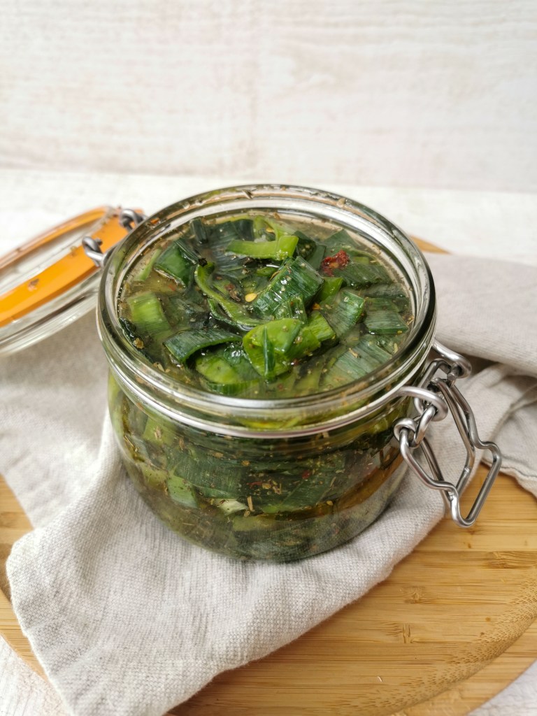 Essorer les verts de poireaux à la main, les placer dans un bocal, ajouter des herbes et aromates (aneth, poivre, etc) et couvrir au tant pour tant d’huile neutre et d’huile de sésame. Fermer le bocal, laisser reposer au moins 3 jours et déguster.