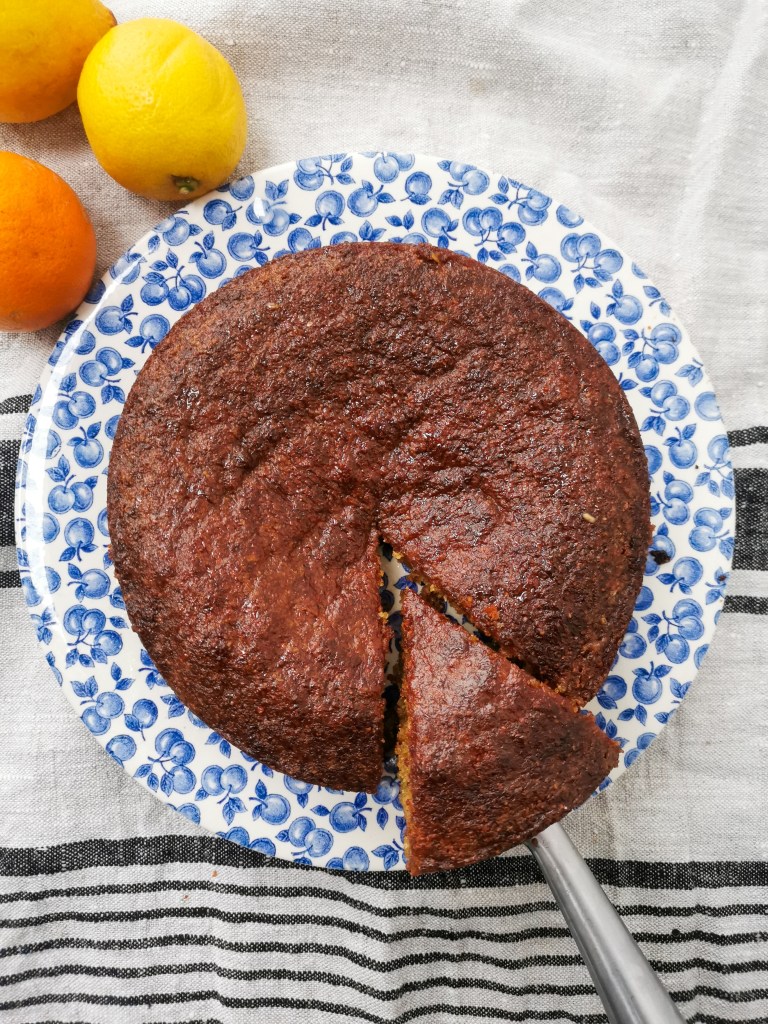Quand le gâteau est presque cuit, préparer un sirop en portant à ébullition les 70 gr de sucre avec les jus d’agrumes. Verser le sirop sur le gâteau dès la sortie du four et laisser refroidir.